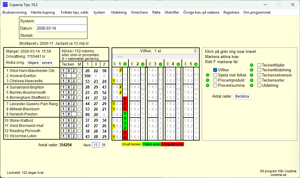 I villkor 2 har vi markerat tecken i 5 matcher och satt kravet att alla tipsrader i systemet ska ha 1-3 av de markerade tecknen.